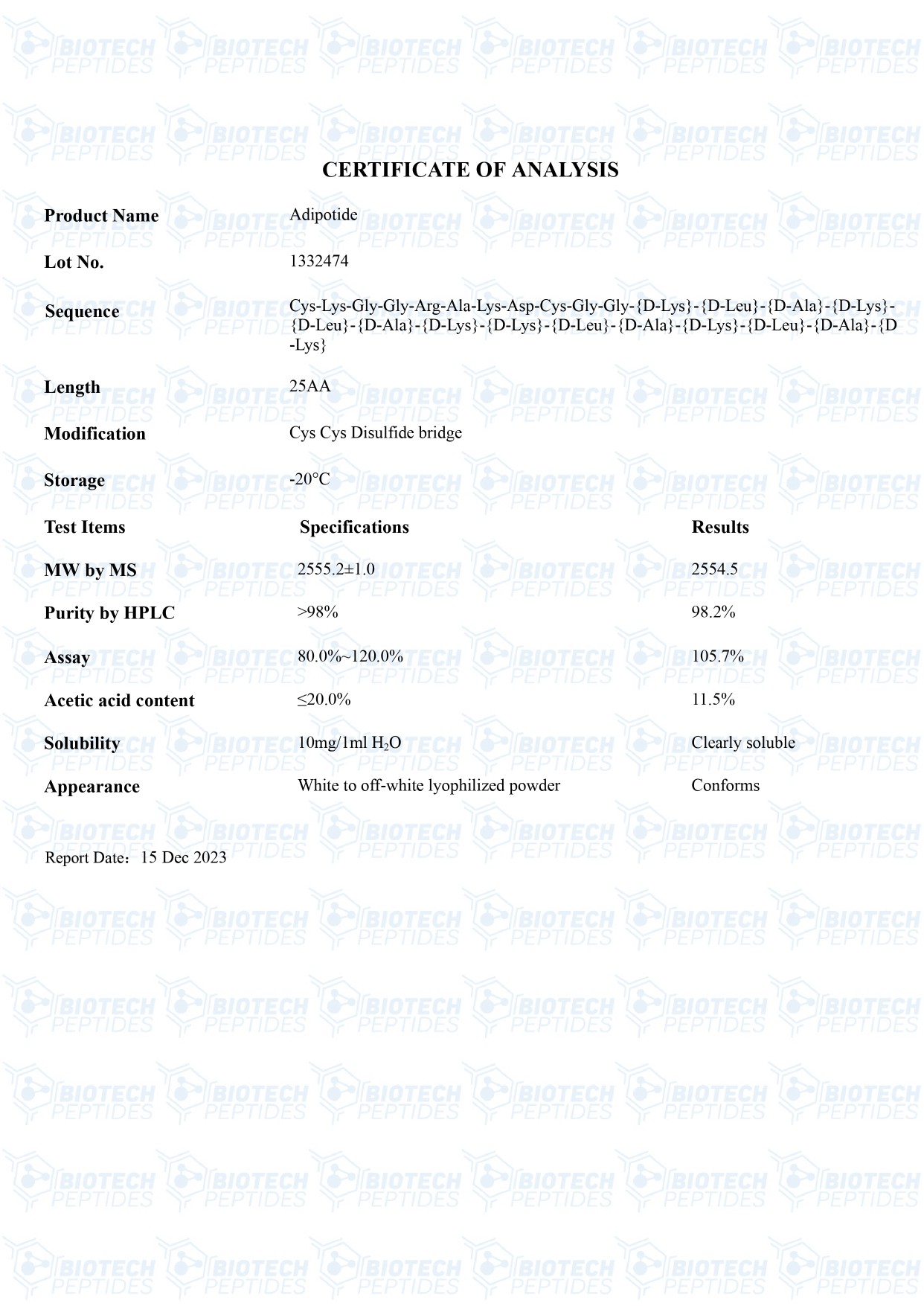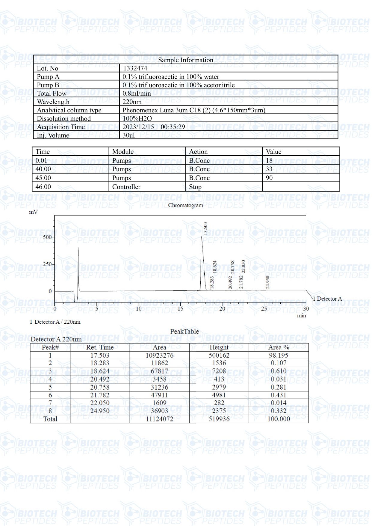 This product is strictly for research/laboratory use only. Human or animal use and/or consumption is strictly prohibited by law. Only qualified and licensed professionals should handle these products. Any information found on Biotech Peptides is strictly for educational purposes only. Refer to our terms and conditions for more details.