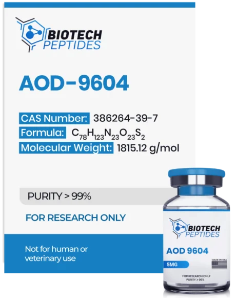 AOD 9604 is a modified peptide initially developed as an offshoot in obesity research. It modifies the peptide Fragment 176-191 of the growth hormone hGH by adding a tyrosine residue to the N-terminus. The proposed mode of action of AOD 9604 has been suggested by researchers to be restricted to promoting lipolysis, thus linking the synthetic compound to obesity research.[1] The peptide does not appear to affect levels of insulin or IGF1 in studies thus far; therefore, it does not appear to trigger diabetes development or induce glucose intolerance in test models, though further studies are necessary to explore this aspect.[2]