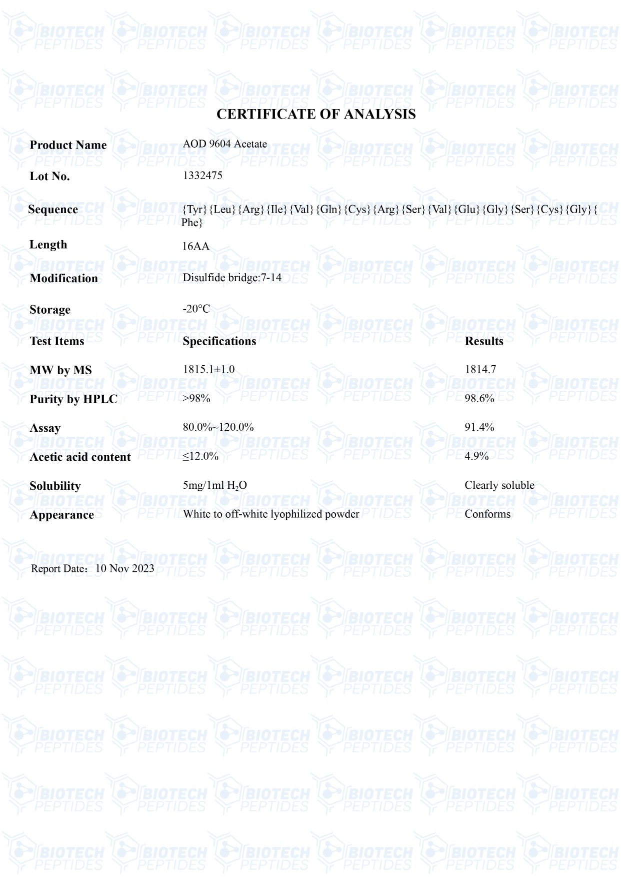 - Cox, H. D., Smeal, S. J., Hughes, C. M., Cox, J. E., & Eichner, D. (2015). Detection and in vitro metabolism of AOD 9604. Drug testing and analysis, 7(1), 31–38. https://doi.org/10.1002/dta.1715