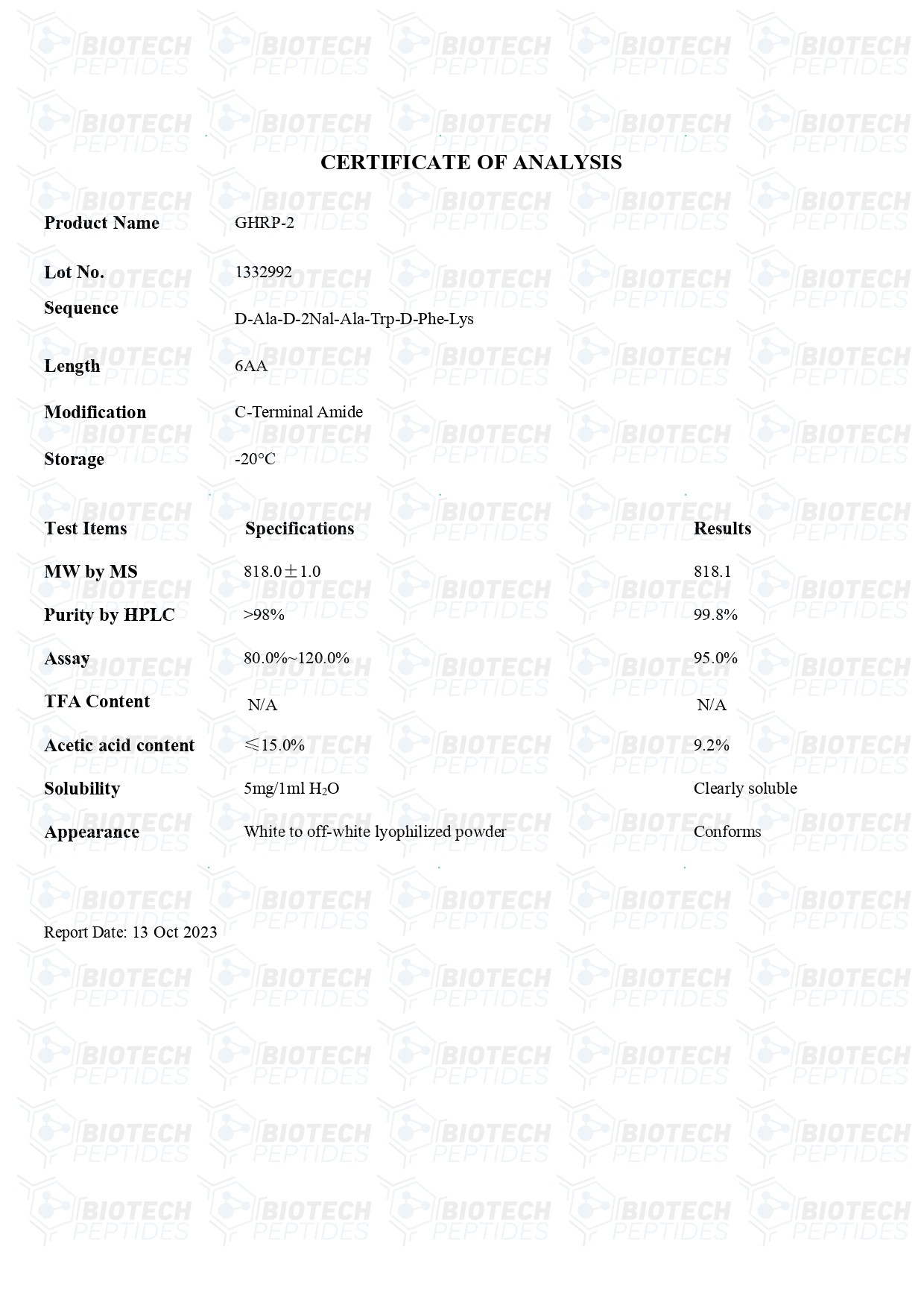GHRP-2, also known as Pralmorelin (also available in 10mg) is a synthetic growth hormone secretagogue that researchers consider may interact with the ghrelin/growth hormone secretagogue receptor found on pituitary cells. It is a pentapeptide consisting of five amino acids and bears a resemblance to the endogenous neurotransmitter, met-enkephalin. It is proposed, albeit with uncertainty, that GHRP-2 may not function as a typical neurotransmitter. Rather, it is hypothesized to engage with ghrelin receptors. Ghrelin, identified as a hormone that regulates appetite, may be affected by interactions with GHRP-2. There is a conjecture that GHRP-2 might induce the secretion of growth hormone (GH) through potential interactions with ghrelin receptors on the pituitary gland, specifically the growth hormone secretagogue receptors (GHS-Rs). Yet, the nature of this interaction is still under investigation and not conclusively established. Extensive research has also been performed to evaluate its role in regulating various physiological processes, including muscle development, appetite, immune functions, and sleep cycles.[1]