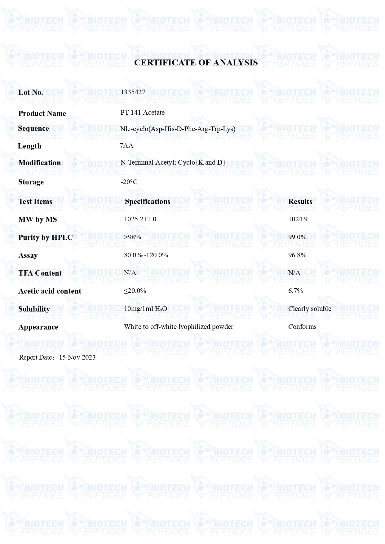 PT-141, also known as Bremelanotide, was derived from a synthetic melanocortin analog known as Melanotan 2 (MT-2). A melanocortin analog, such as PT-141 and MT-2, is considered to be any synthetic compound designed to mimic or influence the functions of natural melanocortin peptides. These peptides, such as the alpha-melanocyte stimulating hormone (α-MSH), may be involved in a range of physiological processes including appetite regulation, energy homeostasis, immune responses, and skin cell pigmentation. PT-141 is a melanocortin analog that was developed to interact with Melanocortin-4 Receptor (MC-4R). It has been studied for a variety of potential characteristics and bioactivities through its interaction with this receptor. Apart from MC-4R, there are other melanocortin receptors like MC-1R, MC-2R, MC-3R, and MC-5R, each associated with different potential functions. For instance, MC-1R may be primarily involved in skin cell and hair follicle pigmentation, MC-2R appears to play a crucial role in the adrenal axis and stress response, MC-3R is implicated in the regulation of energy homeostasis, and MC-5R has been linked to exocrine function and thus impacts processes such as sweating and sebum production.
